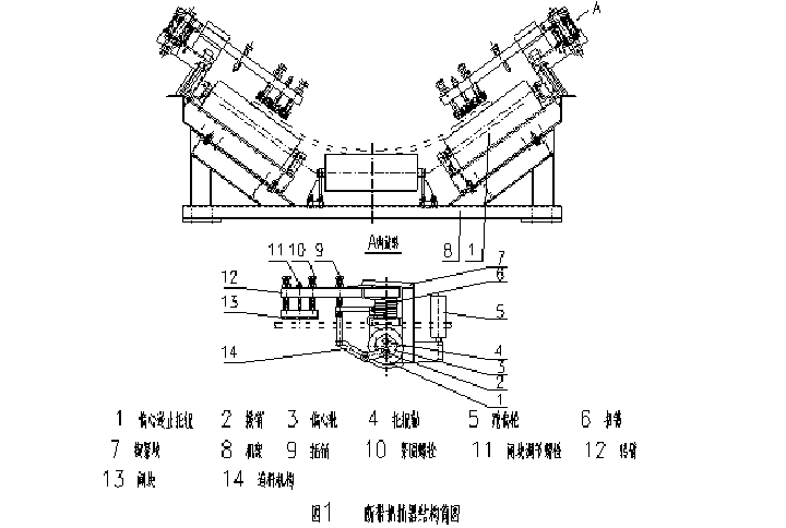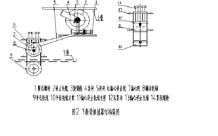 下斷帶保護(hù)裝置(見圖2)主要有逆止托輥2、平行托輥9、偏心逆止托輥6、制動(dòng)連桿5、撥桿4等組成,偏心逆止托輥內(nèi)裝有偏心輪6、制動(dòng)輥軸8及偏心輪傳動(dòng)機(jī)構(gòu),逆止托輥裝有撥銷輪3及傳動(dòng)機(jī)構(gòu)。