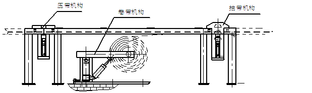 2、 啟動拉緊機(jī)構(gòu)進(jìn)行松繩,拉緊小車同時送開皮帶。開啟抽帶機(jī)構(gòu)的液壓馬達(dá)驅(qū)動固定輥,使其順時針旋轉(zhuǎn),通過固定輥和活動輥的摩擦力將皮帶滾出,使皮帶在壓帶機(jī)構(gòu)和抽帶機(jī)構(gòu)之間縮曲,用剪刀剪斷,將皮帶斷頭安裝在卷帶機(jī)上。